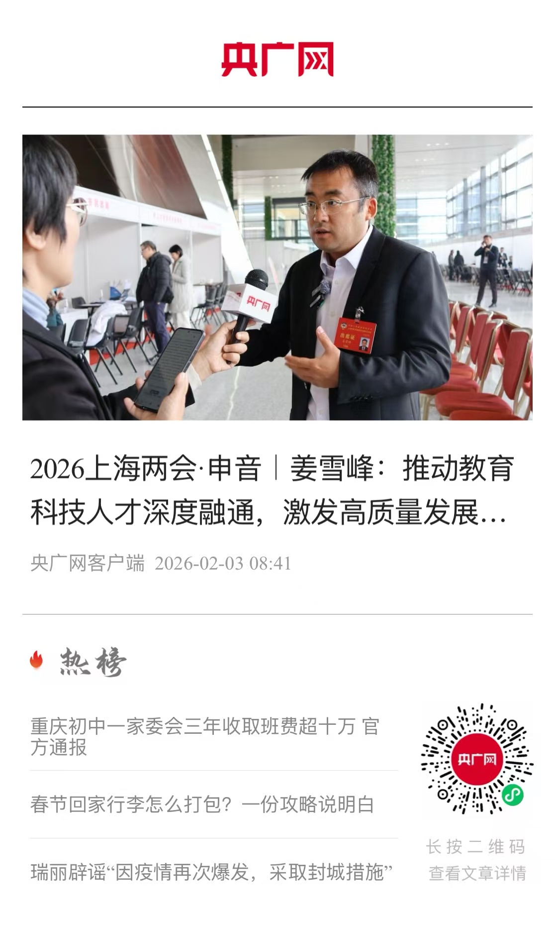 她强调,在推进国际航运中心与贸易中心建设的过程中,高素质技能型人才发挥着不可或缺的支撑作用。为此,要系统强化职业教育与产业需求的对接效能。此外,徐斌艳委员还提交了关于进一步优化上海市普陀区优质教育资源供给和聚焦职业教育垂类应用场景,培育Al+技能型人才的提案。