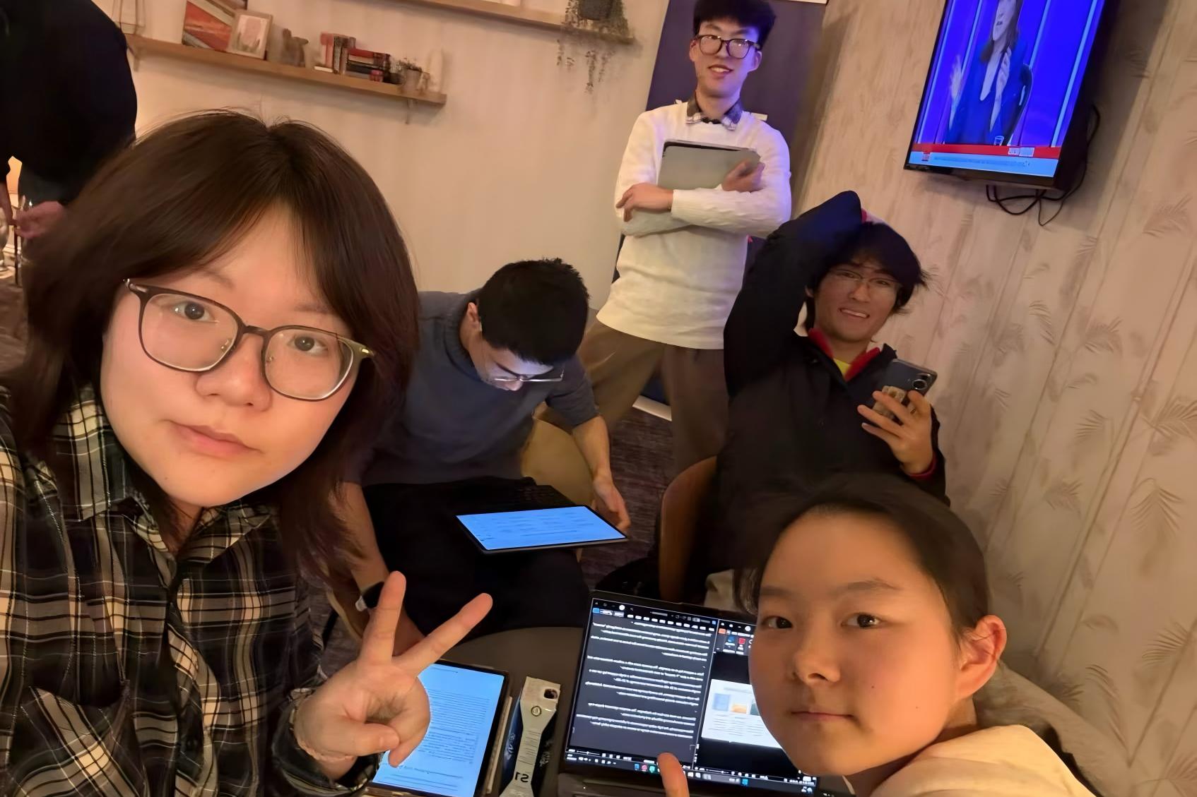 黄奕(右三)和同事在工作会场