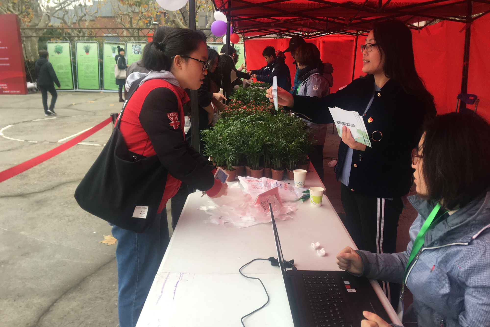 今年活动现场还有这么一群特别的人,他们就是后勤党工委第五支部的党员们。他们立足自身岗位,充分发挥党员先锋模范作用,带头充当志愿者,提供现场指引并设计物业方面的有奖竞猜环节,精心挑选的绿色环保的涂鸦式购物袋也非常受师生的欢迎,摊位前瞬间排了长队,当天共发放环保帆布袋50个,折叠购物袋60个。