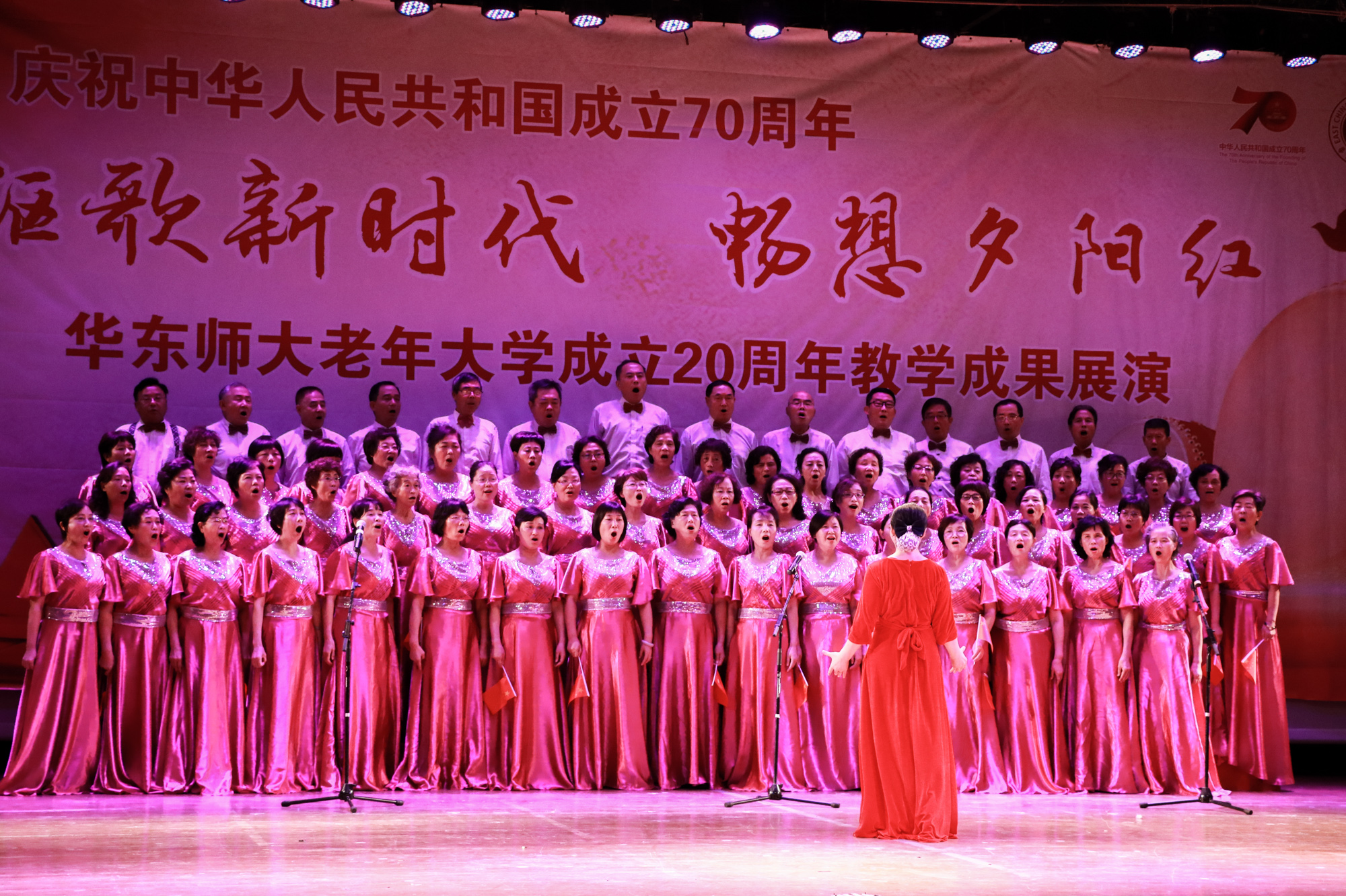表彰仪式结束后,老年大学第七届教学成果展演开始。在汇报演出中,来自各个专业班级的近500名学员表演了合唱、舞蹈、二胡合奏、诗朗诵、时装表演、太极扇、英语联唱、越剧等22个节目。丰富多彩的节目不仅彰显了中华民族传统文化的魅力,也展现出世界文化的丰富性与多样性。参演学员虽均已年过半百,更有些鹤发童颜、年过耄耋,但他们精彩纷呈、活力十足的表演赢得了台下观众阵阵掌声。学员们用精彩纷呈的节目表现出老年大学的教学成果,用嘹亮的歌声歌颂建国70周年,用优美的舞姿讴歌新时代、畅想夕阳红。