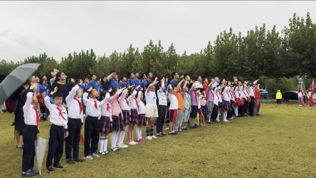 歌声中、欢呼声中,全场师生轻舞手中的国旗,一面巨幅国旗徐徐展开。从高处望去,一片热闹的鲜红在现场翻涌,如同师生心头澎湃的热血,这一抹抹中国红应是这个秋天最美的风景。