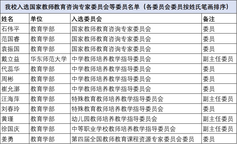 我校12位教师入选国家教师教育咨询专家委员会、教育部高等学校中学教师培养等教学指导委员会和第四届全国教师教育课程资源专家委员会委员