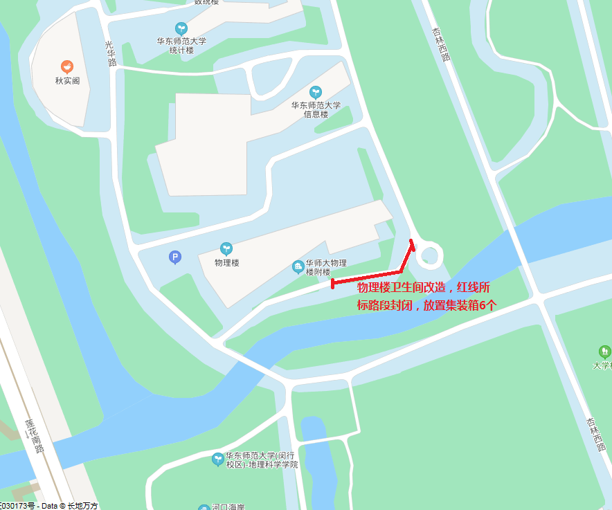 因闵行校区物理楼修缮改造工程,将对物理楼南侧沿河道路部分路段进行封闭。 施工时间为 2021 年 4 月 18 日至 8 月 30日。