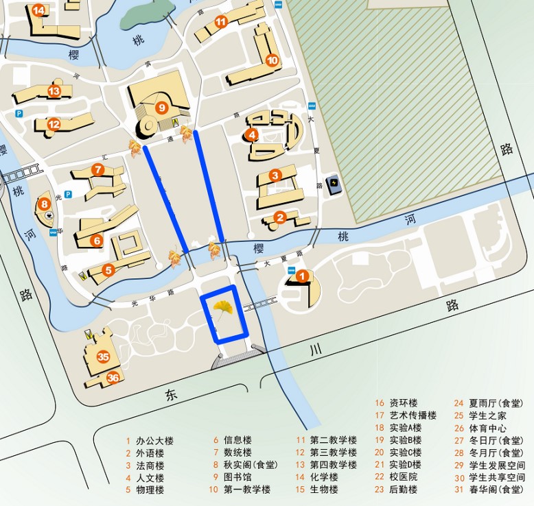 普陀校区华夏路(正门——大桥)、校园八大景之一“古木清晖”;闵行校区南门银杏林、杏林东路、杏林西路