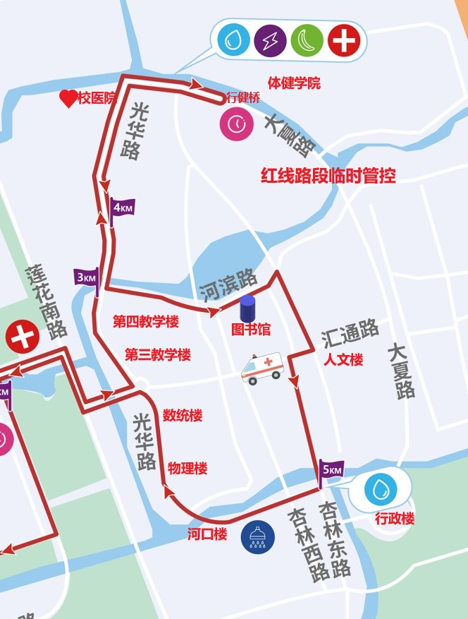 因闵行区委、区政府主办的“大零号湾·无限π跑”活动将在闵行校区举行,现定于2025年5月25日(周日)8:00-11:00,对闵行校区莲花南路校门及校园部分道路实施临时交通管控,临时管控区域详见示意图。