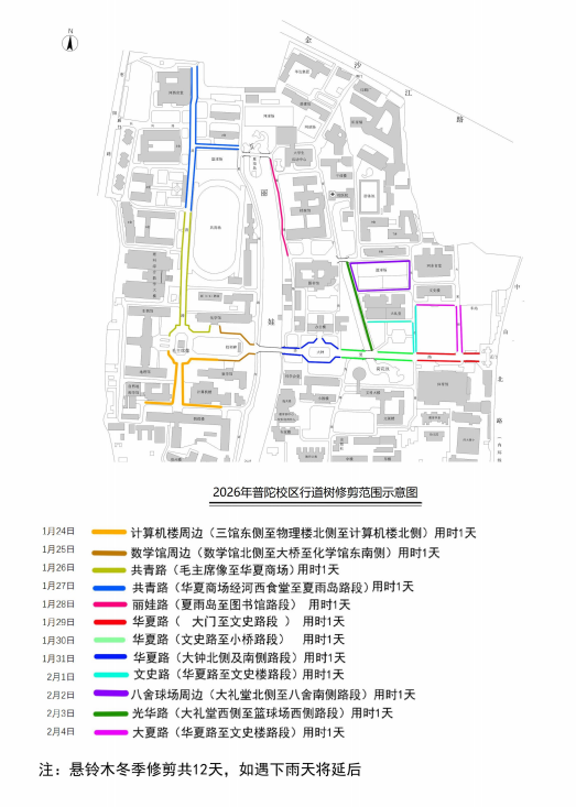 作业时间:2026年1月24日(星期六)至2月4日(星期三),作业期间采取分段修剪的模式,详细时间及路线见附图。请广大师生员工在修剪期间绕行,请勿将车辆停靠在作业路段沿线车位。