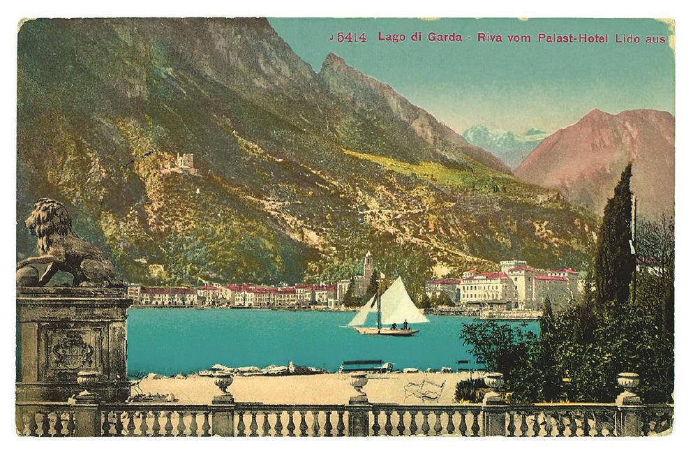 但与同时代大多数人相比,卡夫卡确实已经走得相当多,也相当远。巴黎,维也纳,米兰,威尼斯,维罗纳,柏林,莱比锡,德累斯顿,这些欧洲著名城市都留下了K博士的足迹;北海,波罗的海,阿尔卑斯南麓的加尔达湖,也有他悠游的投影。北方的清冷,南方的明亮,城市的繁华,山区的幽静,拥有固定年假的卡夫卡都曾细细领略过。从卡夫卡的行踪里,我们可以大致揣摩20世纪头20年欧洲中层公务员的热门旅行路线和消费水准——一种远超当时普通工薪阶层的度假疗养方式。作为小说家的卡夫卡遗世独立,而作为观光客的卡夫卡却乐于随大流,最喜欢去的地方是瑞士阿尔卑斯山区和意大利北部。这位苦恼的布拉格保险局专员一旦踏上长途火车与轮渡,进入异国他乡的空间,就像换了一个人似的,姿态放松,心绪活跃,明信片也写得调皮。比如1909年9月7日,卡夫卡在加尔达湖畔的里瓦度假,同行的还有他最好的朋友马克斯·布罗德和他的弟弟奥托·布罗德,卡夫卡寄给小妹奥特拉的第一张明信片上写着:“亲爱的奥特拉,请在店里勤奋工作,这样我就可以无忧无虑地在此地度过愉快的时光,向亲爱的父母问好,你的弗朗茨。”