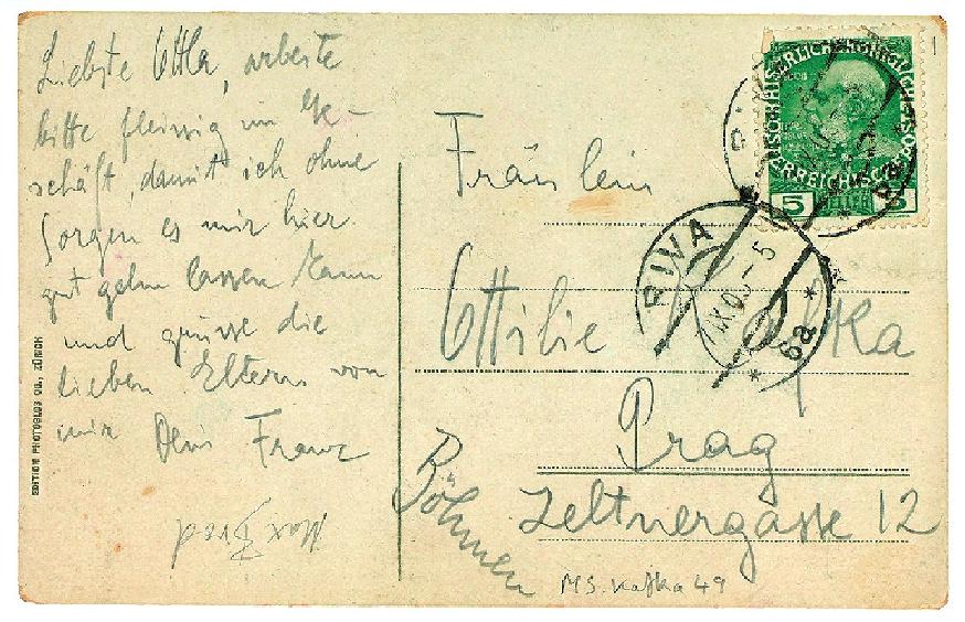 1909年9月7日,弗朗茨·卡夫卡从里瓦寄给小妹奥特拉的第一张明信片的正面和背面。上面写着:“亲爱的奥特拉,请在店里勤奋工作,这样我就可以无忧无虑地在此地度过愉快的时光,向亲爱的父母问好,你的弗朗茨”。明信片下方还有马克斯·布罗德倒写的签名(本版图片除注明外均由作者提供)