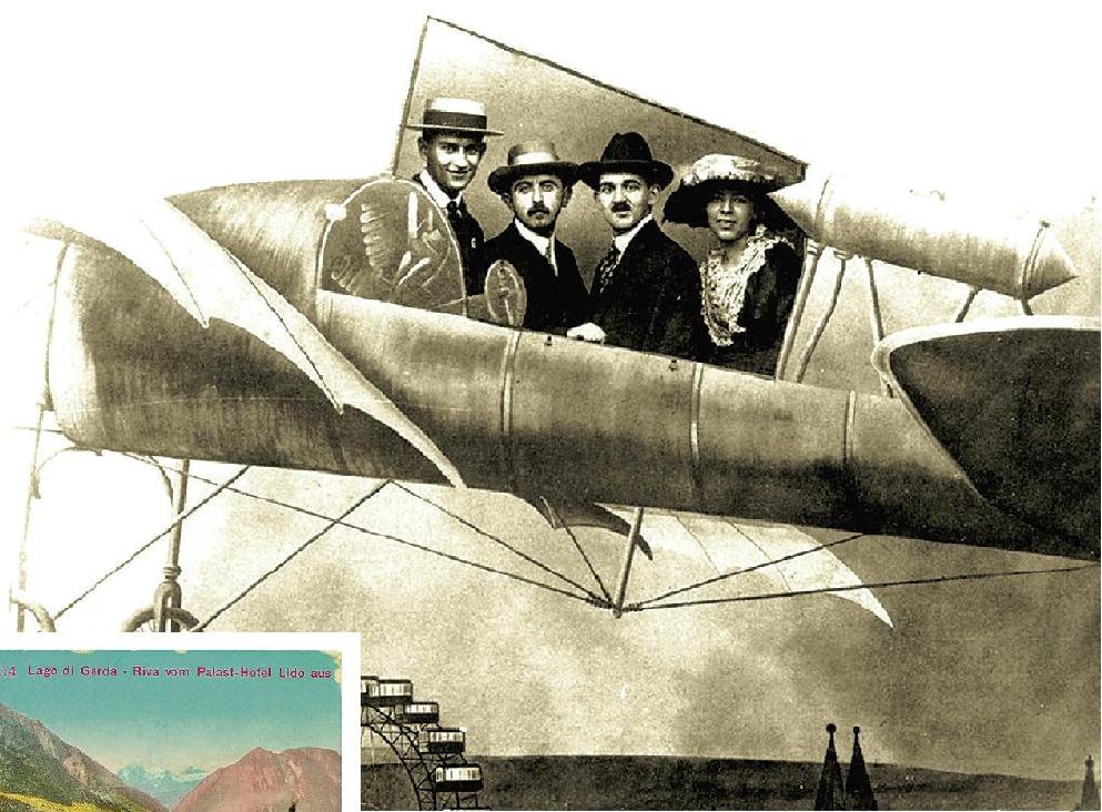 每到一地,卡夫卡不会错过当地的教堂,城堡,名人故居,在观光之余抓住一切机会游泳,似乎在旅途中,卡夫卡对自己身体的羞耻感减轻了很多。卡夫卡的好奇心绝不止于文学和艺术,他也热衷于了解最先进的科技。和布罗德兄弟俩在里瓦度假之际,一则布雷西亚航空展的消息流传开来,听说几位著名的飞行员也将赶来意大利,为公众表演飞行艺术,幽静的湖光山色顿时失去了吸引力,他们仨决定前往布雷西亚一睹盛事。飞行展的观众席里除了意大利的王公贵妇、政治名流,还有歌剧大师普契尼和著名作家加布里埃尔·邓南遮。26岁的卡夫卡站在一张凳子上,飞行员路易·布莱里奥折腾了很久,终于成功驾驶着飞机从他头顶飞过,“所有人都抬头看着他,所有人的心都被他占满了。在距离地面20米高的地方,一个人被困在一个木制框架里,在与自愿接受的,看不见的危险斗争。而我们站在下面,完全被排斥在外,空洞地看着他”——这是卡夫卡第一次目睹人类脱离大地的束缚,冲向蓝天,心中充满惊异和敬畏。而他的作家同行——个子不到一米六的邓南遮则勇敢地爬进了飞机后座,请求飞行员科蒂斯带他飞离地面,哪怕只是几米高。