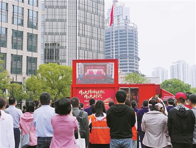 在上海中共一大纪念馆前,干部群众收看中国共产党第二十次全国代表大会开幕会