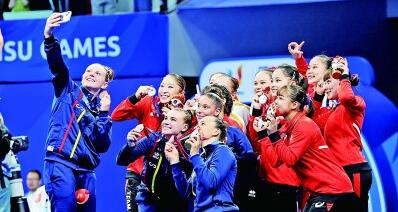 中国体操女子团体夺金后,与其他国家运动员合影