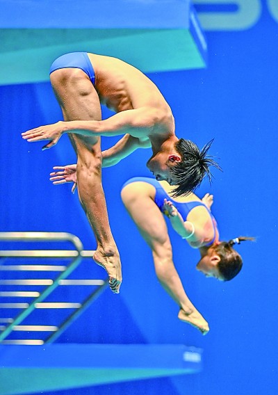 中国选手王伟莹(后)/杨凌在混合双人3米跳板决赛比赛中