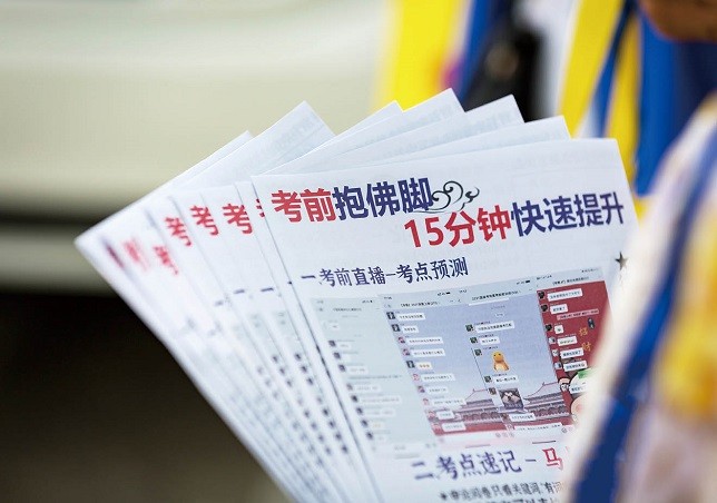 上图:2022年7月9日,河南省2022年统一考试录用公务员笔试安阳市第十中学考点大门前,公务员培训机构的宣传人员抱着一叠“考前抱佛脚”广告资料。