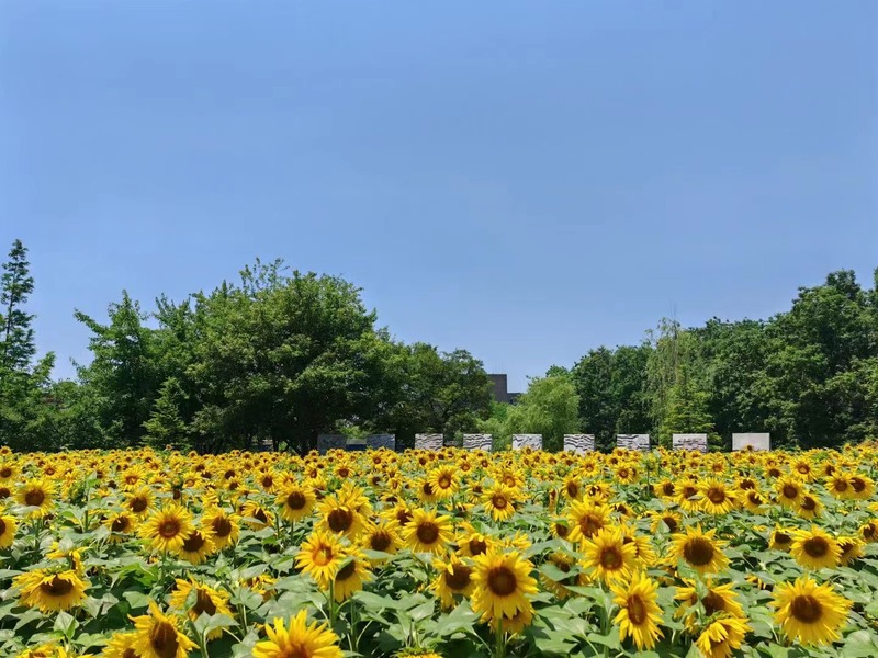 从普陀校区的校训碑花坛、办公楼前花坛、图书馆前草坪,到闵行校区的文脉廊毕业花海区域,两校区约1600平方米的24000多株向日葵,竞相盛放、向阳而生。