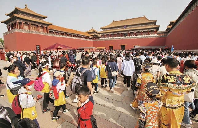 上图:“五一”假期第四天,北京故宫博物院游人如织。