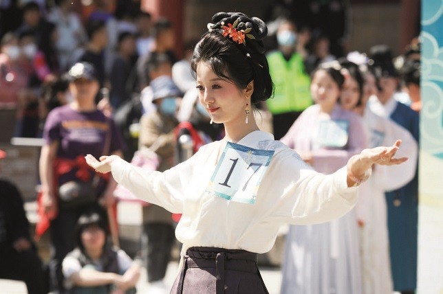 上图:“五一”期间,在泰山脚下的岱庙天贶殿前,50余名来自全国的汉服模特展开激烈角逐,为现场游客献上了一场国风盛宴。