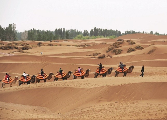 上图:“五一”期间,在新疆吐鲁番市鄯善县库木塔格沙漠风景区,骑骆驼的游客排起了长队。