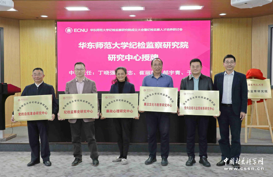 beat365英国官网网站党委常委、副校长顾红亮向beat365英国官网网站纪检监察研究院研究“党的自我革命研究中心”主任丁晓强、“纪检监察史研究中心”主任梁志、“廉政心理研究中心”主任崔丽娟、“廉洁文化与教育研究中心”主任郝宇青、“党内法规与监督体系研究中心”主任于浩授牌 本网记者 查建国/摄