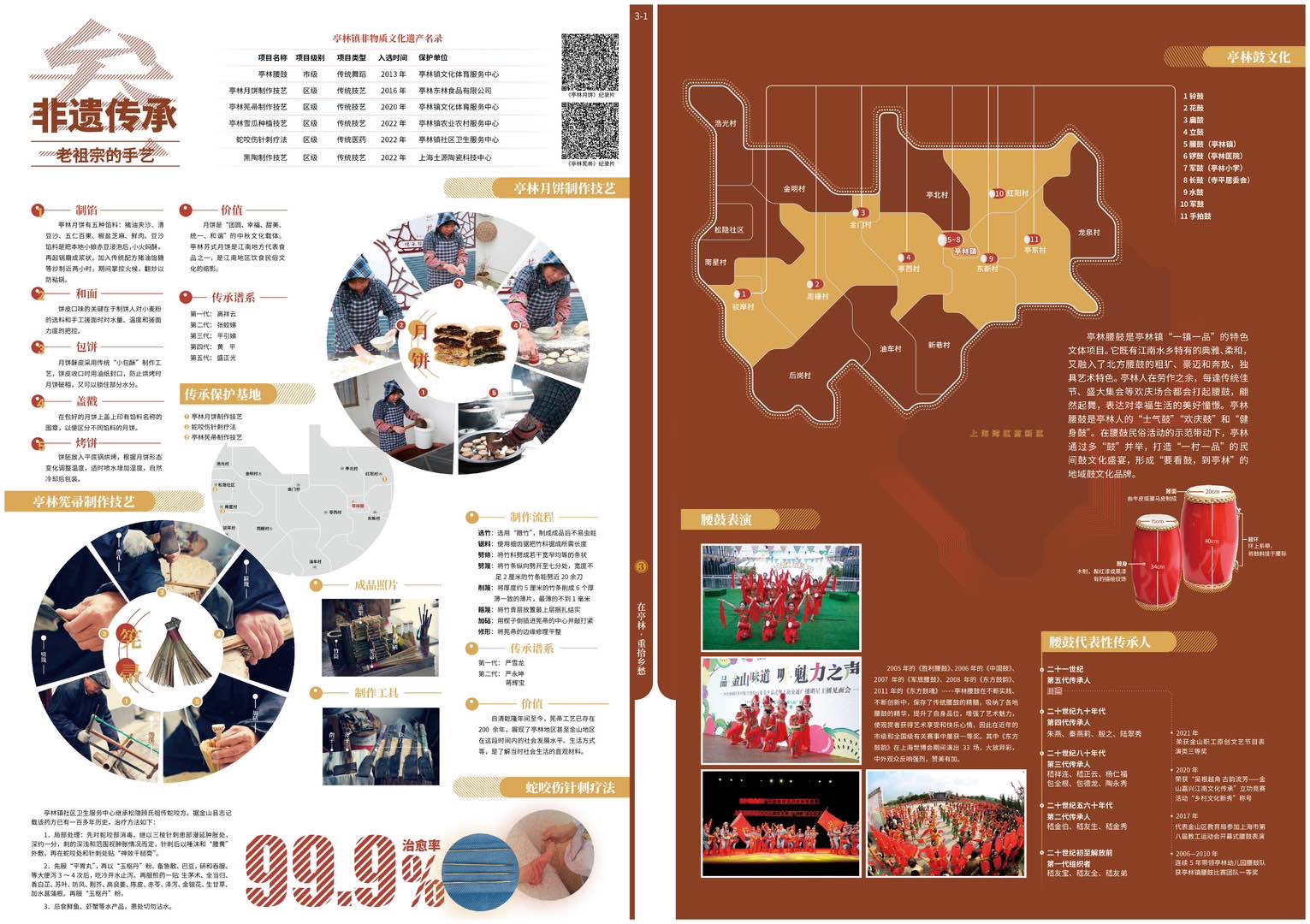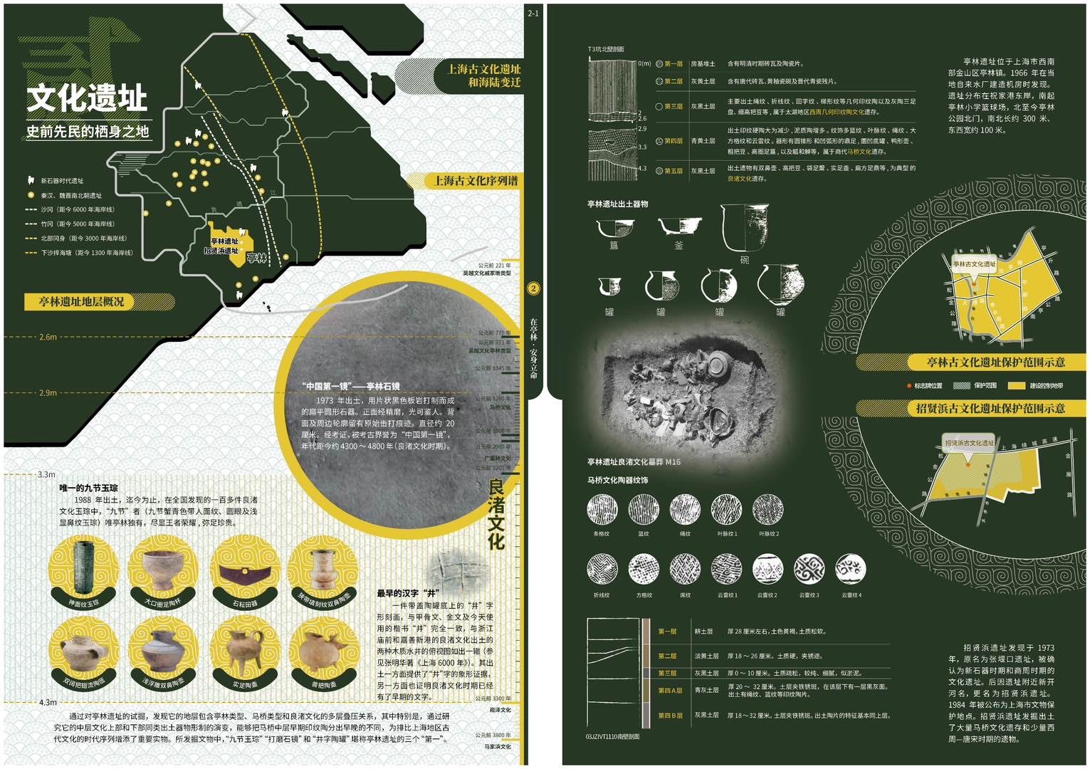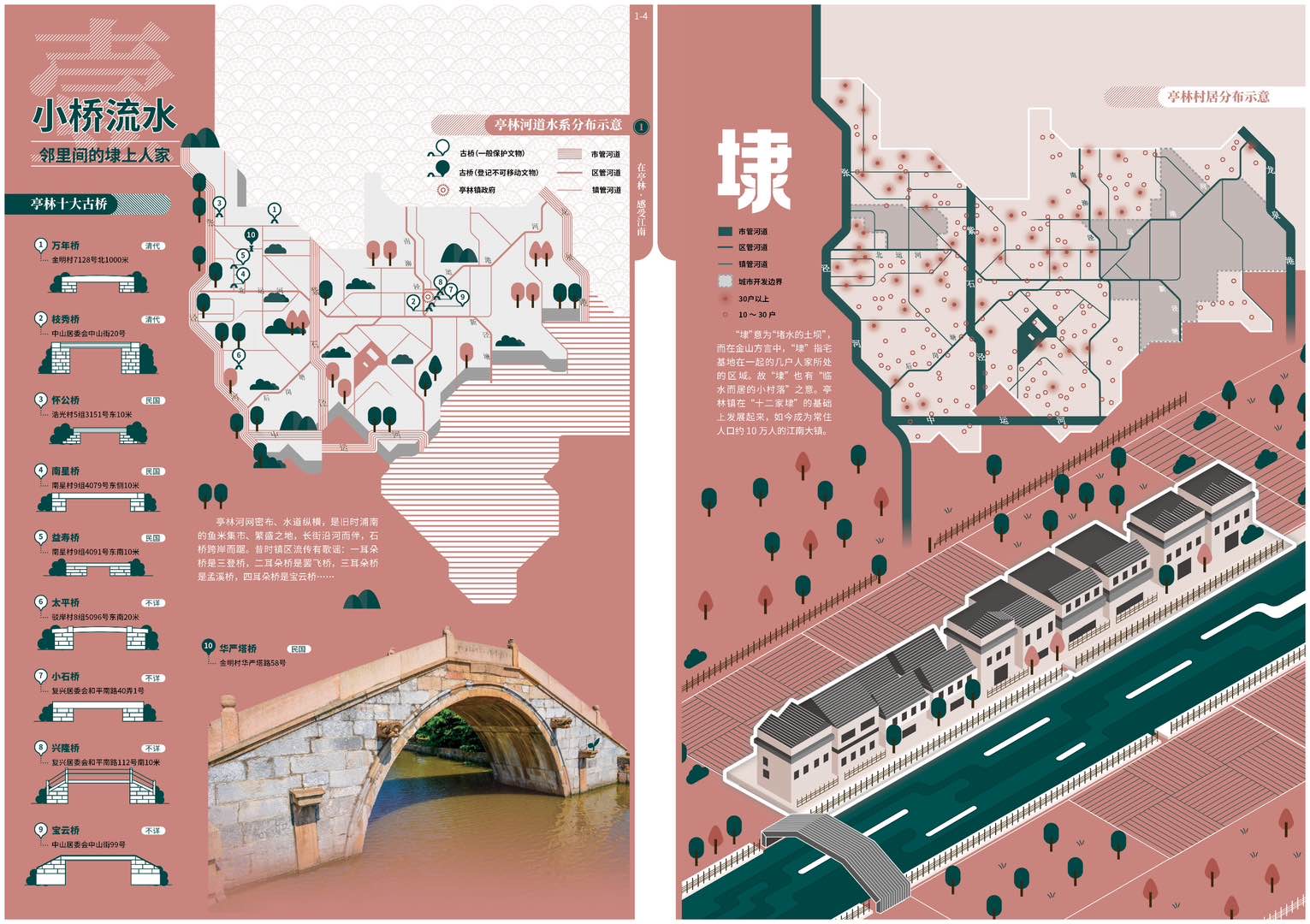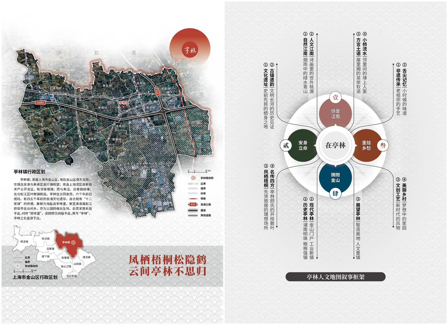 据介绍,《亭林人文地图》以“凤栖梧桐松隐鹤·云间亭林不思归”为隐喻主旨,构建“感受江南”“安身立命”“重拾乡愁”“拥抱金山”等4个图组的叙事线索,渐进式演绎亭林“自然优渥(基础)—人文昌盛(历史)—乡愁浓郁(传承)—城镇繁荣(发展)”的内在逻辑。成果最终呈现15个图幅30个页面的专题时空信息图示,在内容上清晰阐释了亭林镇宜居宜业的江南自然人文背景、丰厚的历史文化遗存和影响,以及优越的产业基础和区位优势。