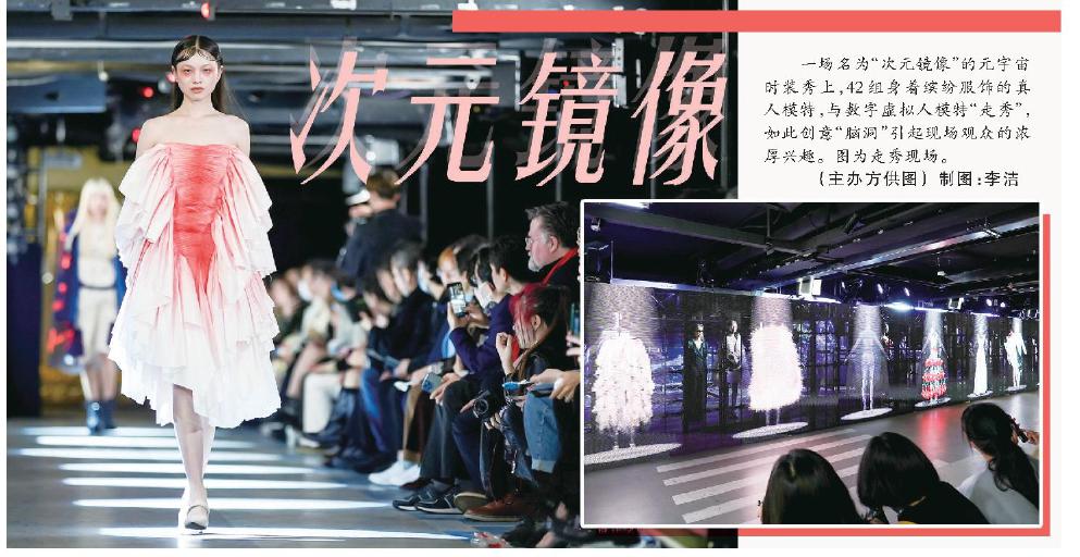 一场名为“次元镜像”的元宇宙时装秀上,42组身着缤纷服饰的真人模特,与数字虚拟人模特“走秀”,如此创意“脑洞”引起现场观众的浓厚兴趣。图为走秀现场。(主办方供图)制图:李洁