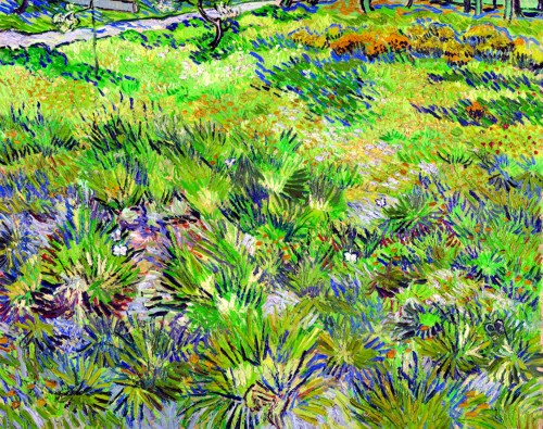 在这幅作品中,梵高细致描绘了一片草地和杂草,几只白色的蝴蝶正在草地上盘旋。画面上方是一条通向远方的小径,给人以无限遐想。梵高将浓墨重彩的笔触在不同方向上彼此叠加,呈现出一片丰富多彩、栩栩如生的动态。他调和了绿色、黄色、赭和白色,又点缀蓝色、丁香色以及紫色来描绘草地丰富的色调,突出和强调对比色和补色的运用。