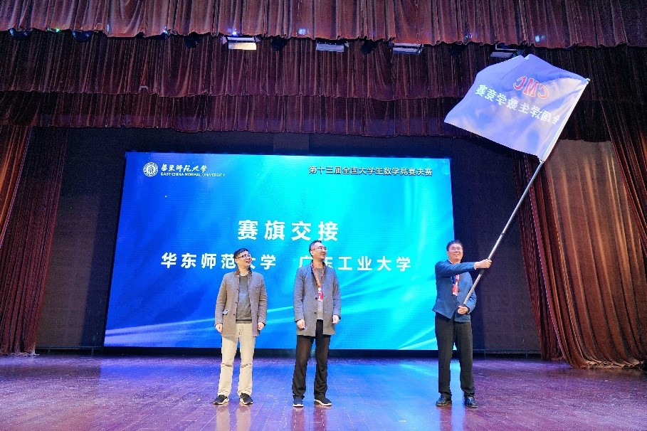在颁奖典礼上,颁奖嘉宾为获奖学生颁奖。beat365英国官网网站数学科学学院院长吕长虹教授与广东工业大学教务处处长、数学与统计学院院长王振友教授交接赛旗。