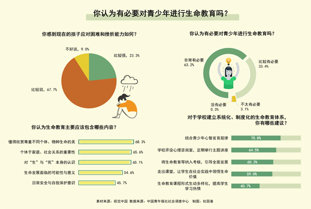 上周,中国青年报社社会调查中心联合问卷网(wenjuan.com),对1525名受访者进行的一项调查显示,67.7%的受访者感到,现在的孩子应对困难和挫折的能力比以前弱了。96.6%的受访者确认有必要对青少年进行生命教育。对于建立生命教育体系,70.8%的受访者建议结合青少年心智发育规律。