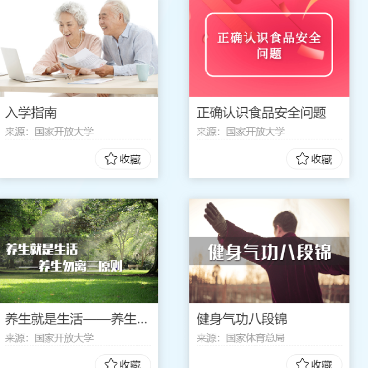其实,除了“云课堂”之外,在“国家老年大学”的网站上,还有大量无需注册就能学习的各种各样的免费课程,由全国各地开放大学、委办局、科普机构等制作,比如上海开放大学的《二十四节气与民俗文化》、科普中国的《气候变化和地球生态》、国家体育总局的《健身气功八段锦》……
