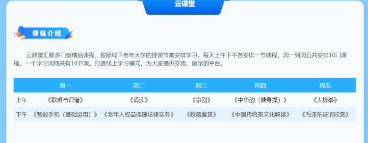 国家老年大学的“云课堂”究竟怎么学习?也许很多老年人还不太清楚。其实,只要打开“国家老年大学”的网站,点击进入课程学习,只要年满50周岁用手机注册就能开启免费的“云课堂”学习。从周一到周五,每天上下午各一门课程,有《歌唱与识谱》、《智能手机(基础运用)》、《京剧》、《太极拳》……每一次学习后,老年人都可以获得相应的积分。