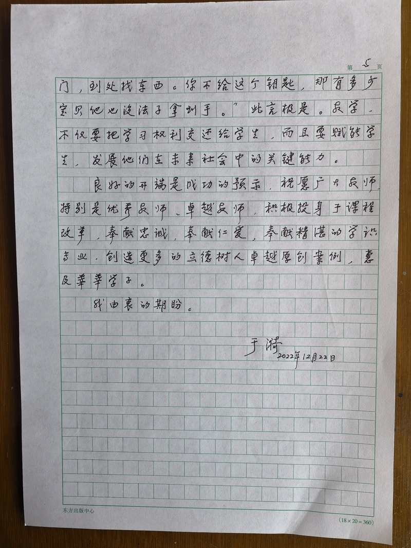 为此,94岁高龄的人民教育家于漪老师亲笔写下长达5页的文稿纸,字字工整、力透纸背、金句迭出。在这封超过1500字的长信中,她欣喜于获奖案例的设计者、实践者主动作为,认为他们以卓有成效的教学变革活动,证明了“创新不是盲目的,而是有底气和积累的支撑”。