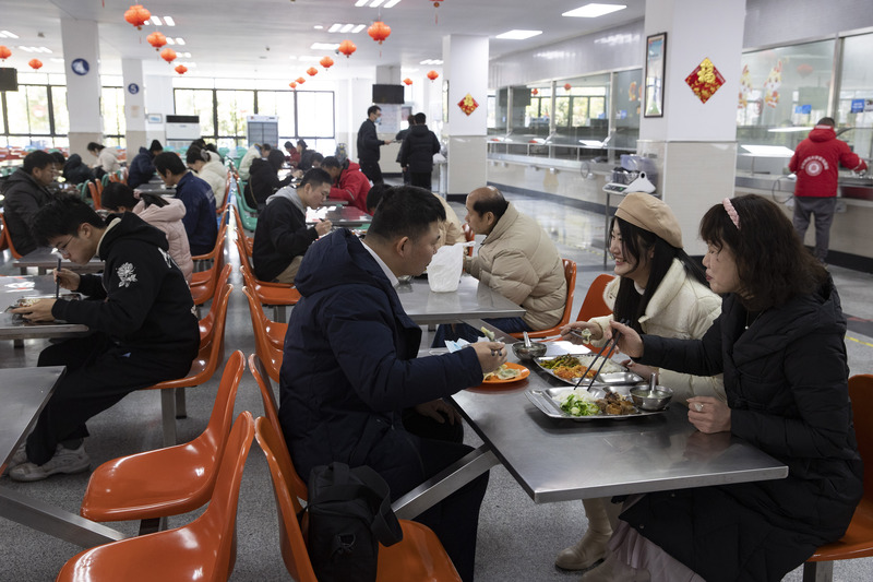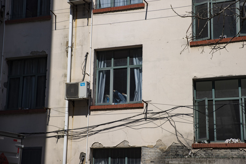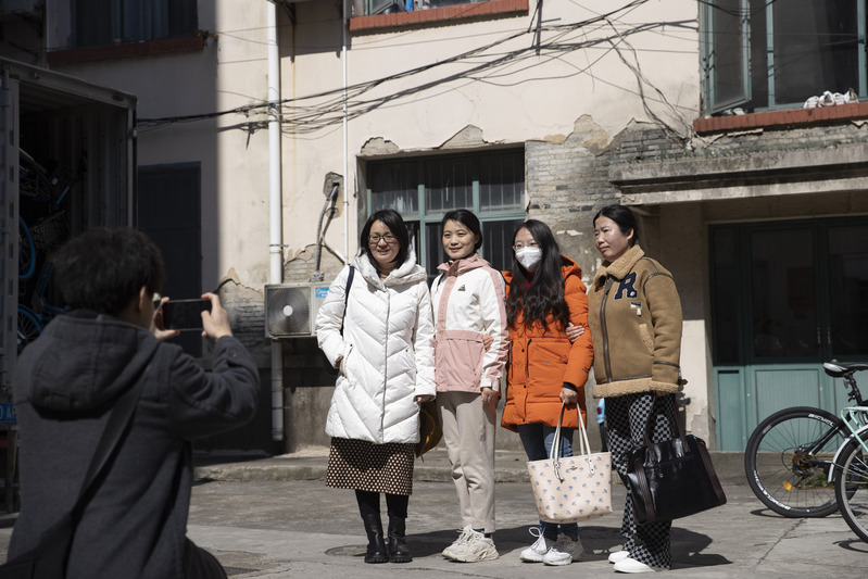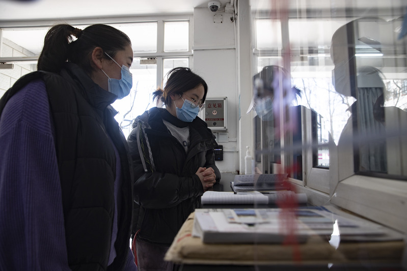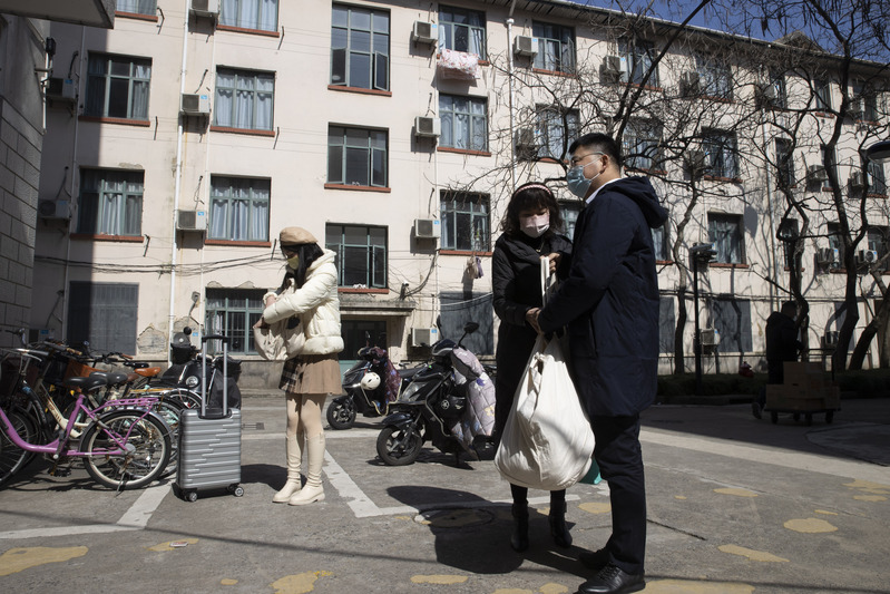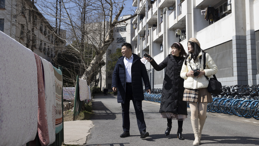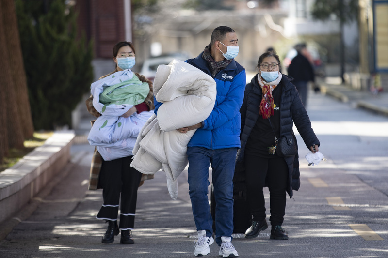 2023年2月26日,beat365英国官网网站中山北路校区,一名家长帮女儿晾晒床单。