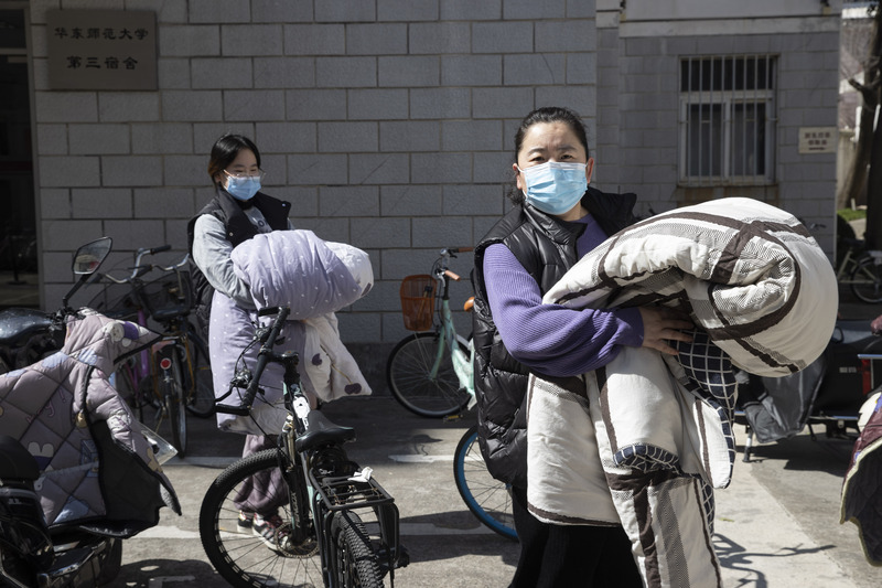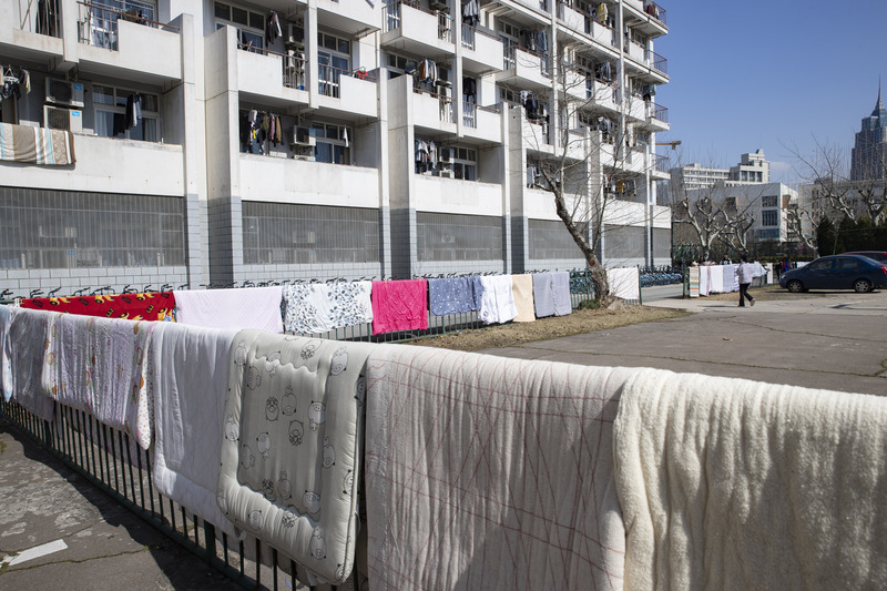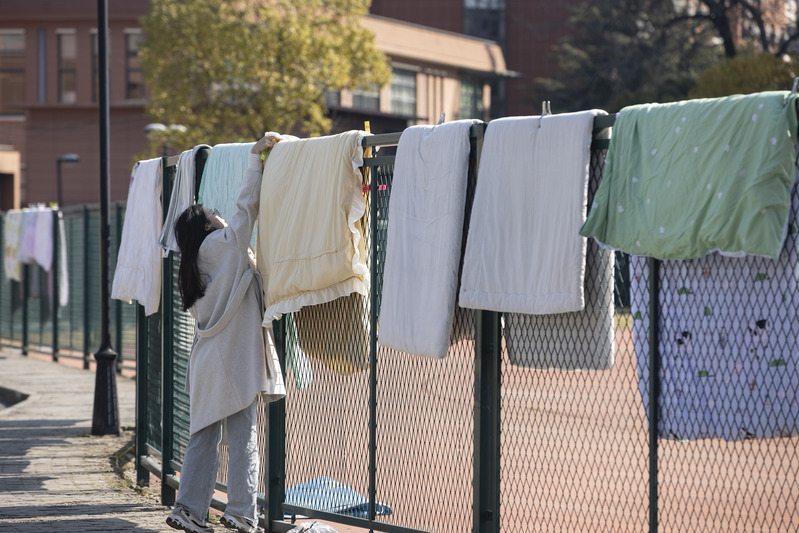 beat365英国官网网站中山北路校区,学生陆续返校,不少学生趁着阳光正好晾晒床单棉被。