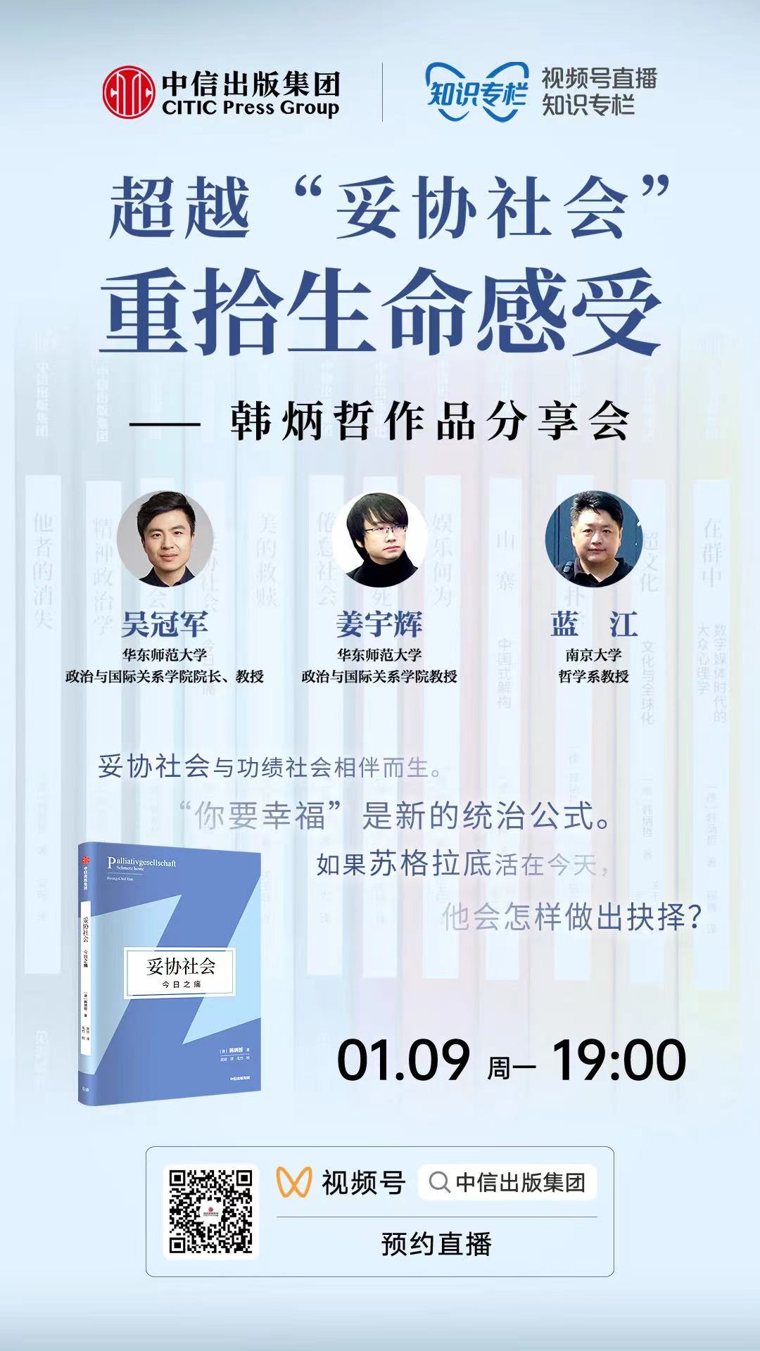 1月9日晚7点,围绕德籍韩裔新生代思想家韩炳哲的《妥协社会》一书,聊聊后疫情时代,我们该如何面对肉体和精神上的疼痛,以及在元宇宙的虚拟世界里,我们会如何理解快乐与痛苦、幸福与创伤。