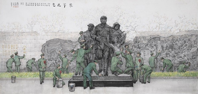 这次他参展的国画作品《永不褪色》就是以南京路上的好八连为绘画对象的。