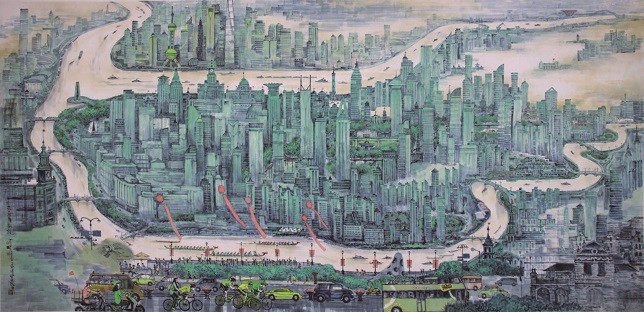 他发现华山观云、观雾的感受,和城市气象有相似之处。于是改用了非常概括的印象画法,同时保留一种意境,更像是在画一座森林城市。画面中勾勒了上海很多标志性高楼大厦的基本外形,其中上海中心就像是整座城市的山峰,代表了一个高度和一种精神,同时还勾勒出了上海的母亲河黄浦江,寓意她哺育了这座城市,使其世世代代繁衍生息。