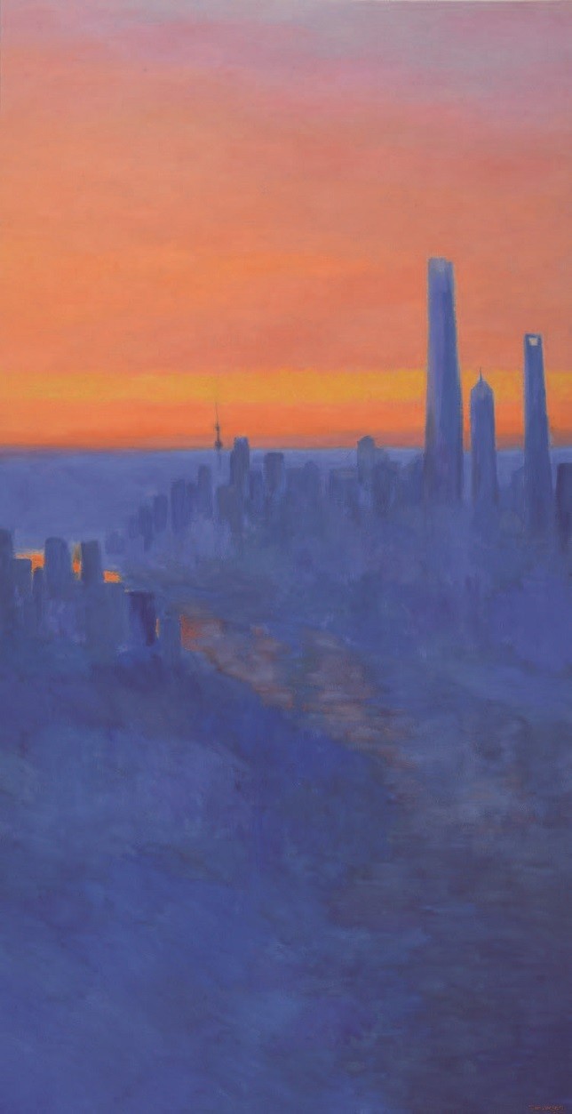 另一幅参展作品名为《日出东方》。《日出东方》这件作品采用了简练质朴、宏观远景的构图,不拘泥于某个细节,没有面面俱到,放大了对颜色的感受力,整幅画苍苍茫茫,再配合日出的景色,营造出层层叠叠的气象。同时颜色上选择了蓝紫色的城区和橙红色的天空,两大色块儿组合在一起,让人感受到强烈、光亮,充满生命力、朝气蓬勃。太阳马上就要升起,城市随即会被照亮,此刻笼罩在晨曦中的上海犹如少年,拥有无限可能,可以拼搏创造,超越自我。