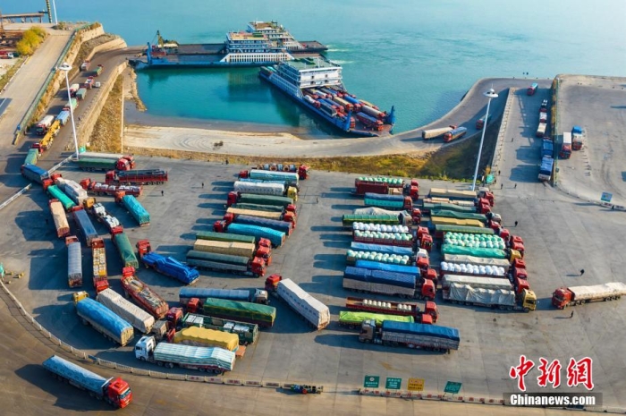 2022年12月下旬,长江三峡西陵峡段,江面船只往来穿梭,滚装码头全天候作业。图为繁忙的秭归滚装码头