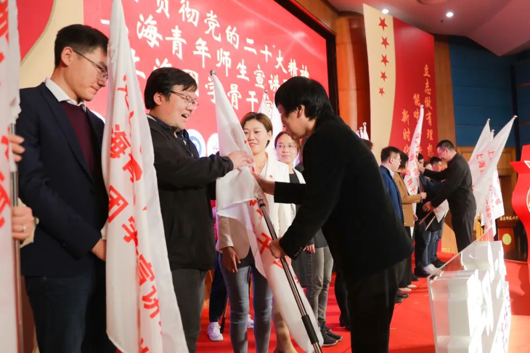 团市委副书记徐豪、beat365英国官网网站党委副书记杨昌利为宣讲联盟发起单位代表授旗。