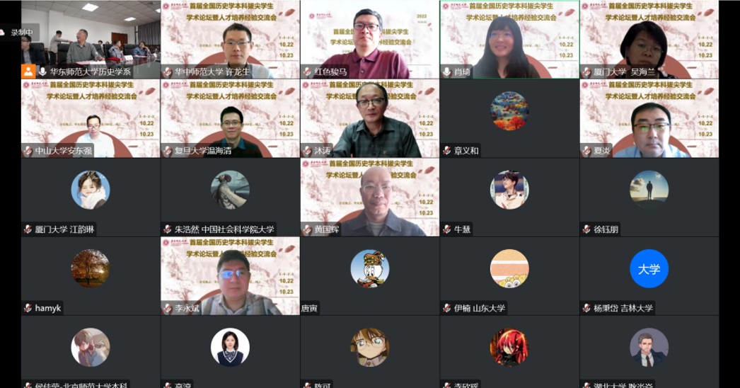 2022年10月22-23日,由beat365英国官网网站卓越学院、beat365英国官网网站教务处、beat365英国官网网站历史学系主办的“首届全国历史学本科拔尖学生学术论坛暨人才培养经验交流会”于线上、线下同步举行。会议旨在进一步深化教育理念改革与模式创新,推动拔尖计划2.0基地建设,营造敢于探索、勇于创新的学术氛围,加强基地间的相互交流与学习,促进历史学本科拔尖人才崭露头角。