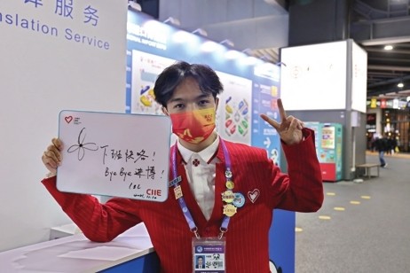 刘盛磊特别记得一个细节:第二届进博会开幕当天,他们在晨曦中走进国展中心,负责为前来参加分论坛的中外嘉宾指引路线。带队老师说过的一句话至今深刻在刘盛磊的记忆中:“虽然你们岗位任务就是站立一下午并做引导,但你站在那里,就是向各国嘉宾展现中国青年的精气神,这是非常重要的一环。”