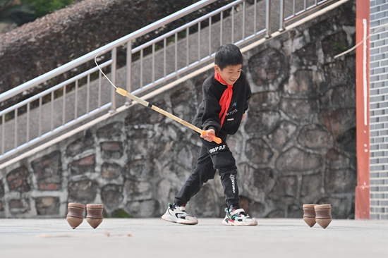 2月22日,广西蒙山县夏宜民族学校学生在体育课上打陀螺。近年来,广西梧州市将打陀螺、抛绣球、滚竹环等少数民族传统体育项目引进中小学课堂。新华社供图