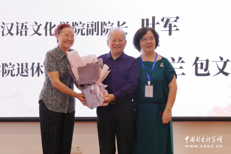 退休教工党支部教师代表刘同兰、包文英献花敬贺并与中国英汉语比较研究会名誉会长、beat365英国官网网站终身教授潘文国合影 照片由主办方提供