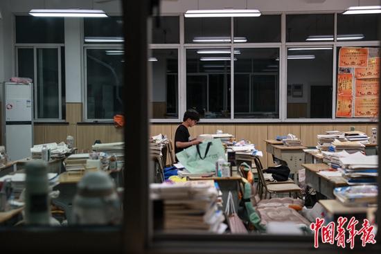 6月3日,浙江诸暨,诸暨职教中心,晚自习结束后,一名高三学生仍留在教室看书。中青报·中青网记者 曲俊燕/摄