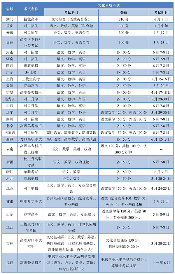 截至2021年,姜蓓佳博士收集到的各省“职教高考”的名称、内容、分值、时间。摘自姜蓓佳博士论文《职教高考制度构建研究》