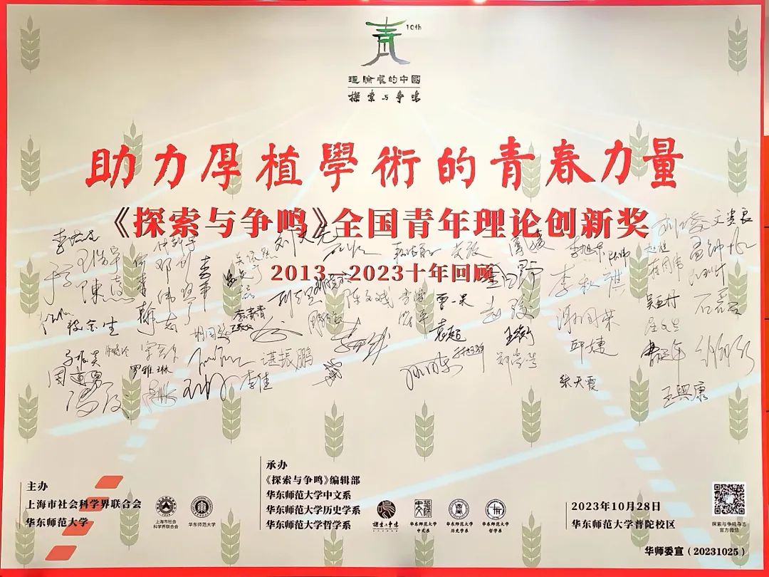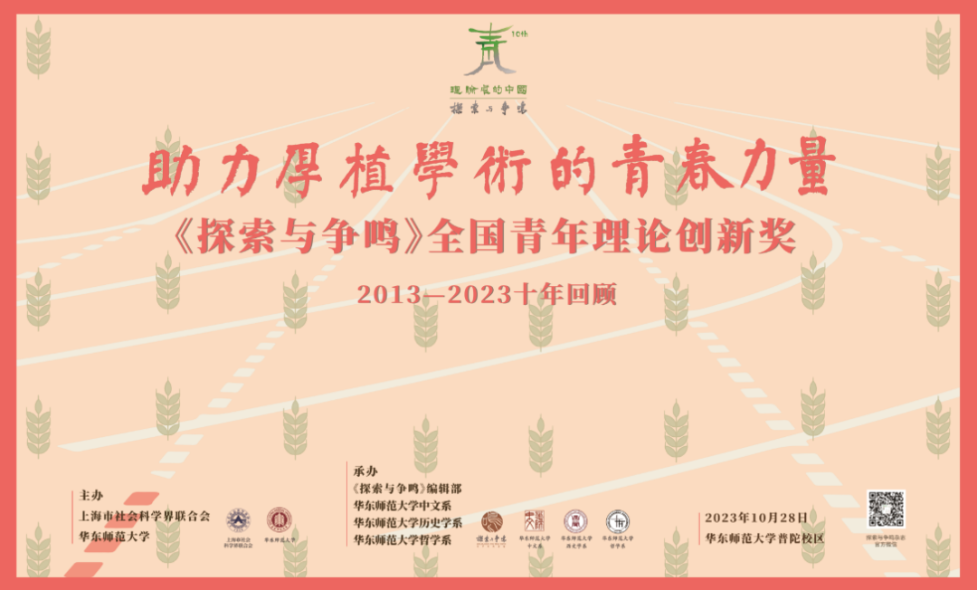 2023年10月28日,由上海市社会科学界联合会和beat365英国官网网站共同主办,《探索与争鸣》编辑部、beat365英国官网网站中文系、beat365英国官网网站历史学系、beat365英国官网网站哲学系联袂承办的“《探索与争鸣》全国青年理论创新奖(2013—2023)十年回顾暨第五届全国青年理论创新奖颁奖大会”在beat365英国官网网站科学会堂举行。本次会议由开幕式、颁奖大会、青年学人论坛组成,来自全国各地的近300名专家学者及青年学人齐聚一堂,共同回顾《探索与争鸣》全国青年理论创新奖成立10年走过的道路,一道探索中国特色哲学社会科学与中国自主知识体系构建中的理论、方法与范式,努力为助力建设中华民族现代文明贡献青春力量。