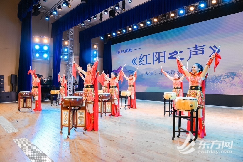表演现场,亭林镇带来特色腰鼓表演。据悉,亭林腰鼓是亭林镇“一镇一品”的特色名片,已被列入上海市非物质文化遗产保护项目。紧密的鼓点与表演者的肢体语言融为一体,独特的地方表演形式展现出中华文化的多姿多彩与非物质文化遗产的独特魅力。