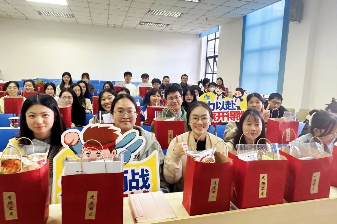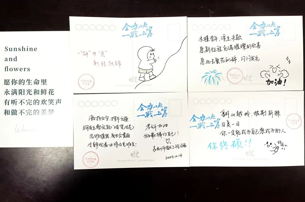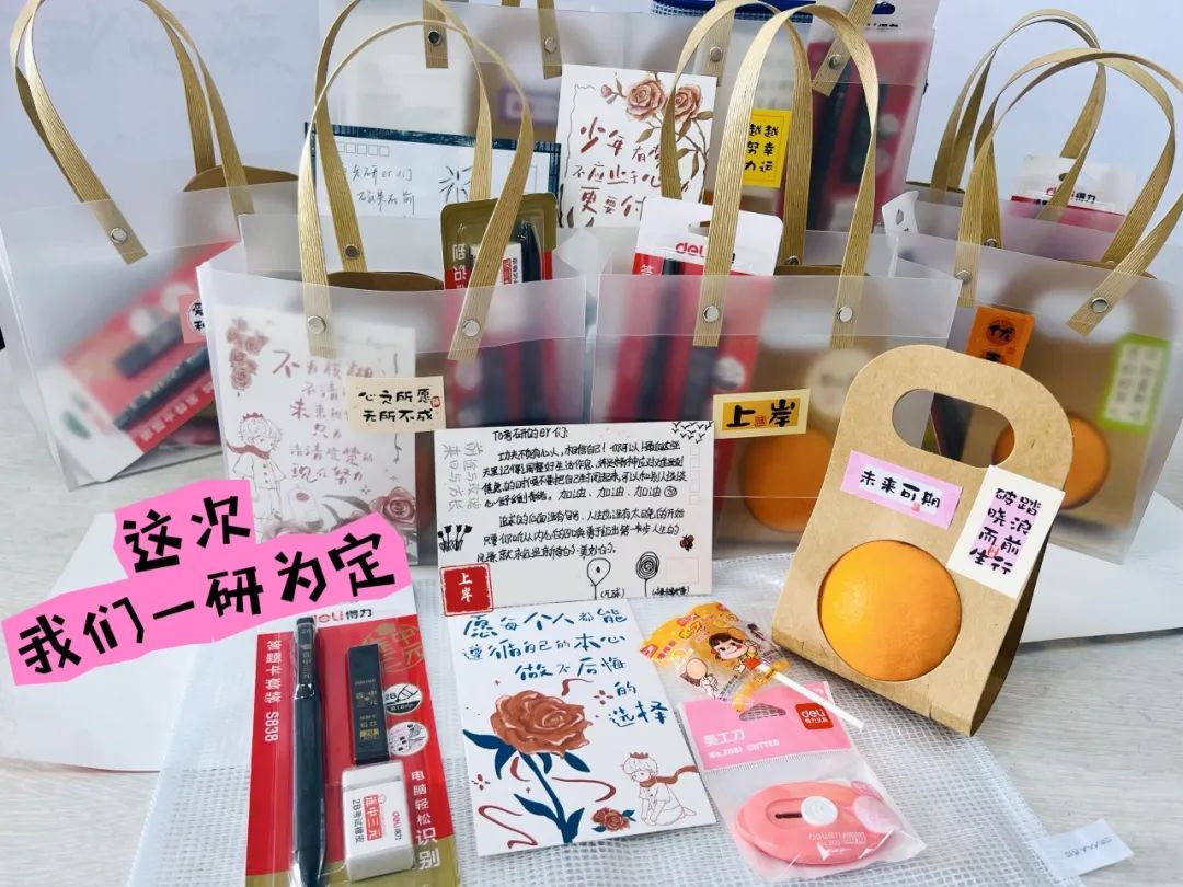 零食大礼包、手写祝福卡、“助考文具包”……在上海应用技术大学,理学院的学弟学妹们通过视频、卡片的形式献上了美好祝福;考前,材料学院的老师们与学子面对面座谈,缓解学生考前压力;城建学院、人文学院为考研同学送上定制的爱心礼包。