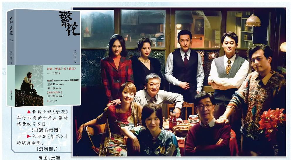 长篇小说《繁花》单行本面世十年来累计销量破百万册。(出版方供图) 电视剧《繁花》片场演员合影。(资料照片)制图:张继
