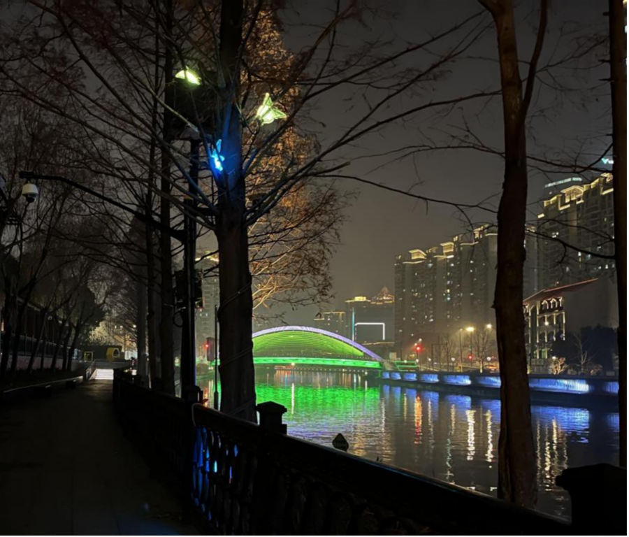 同时,桥梁的灯光设计也应与周边建筑、城市景观相互呼应和契合。以蝴蝶湾花园附近景观为例,附近多为居民区、住宅楼,以暖色调为主,然而旁边的昌平路桥却是以大面积的高饱和度的绿色和蓝色为装饰,使得整座桥在整个景观中显得非常突兀。
