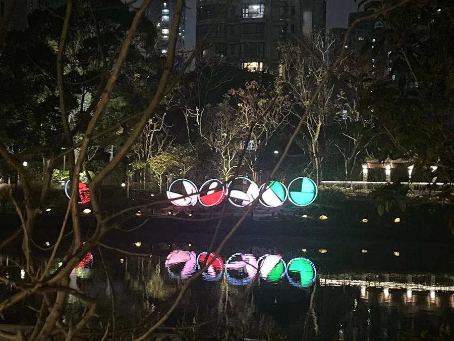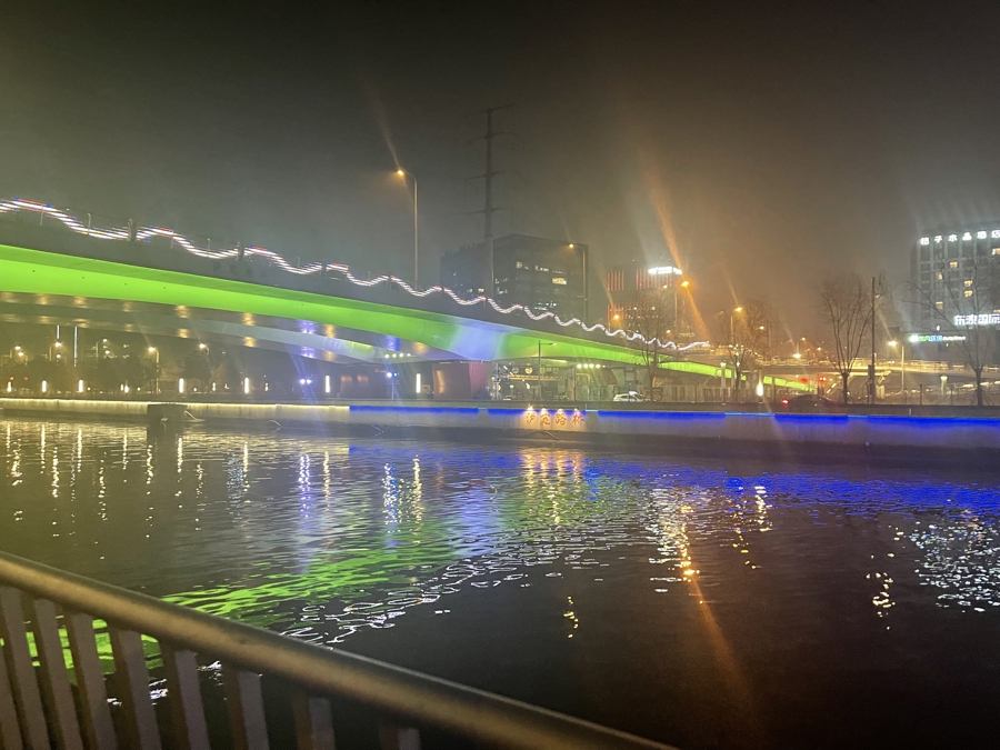 走在岸边、站在桥上、登上居民楼,在灯光的渲染下,波光粼粼的水面倒映出一幅美丽的城市夜景画卷。